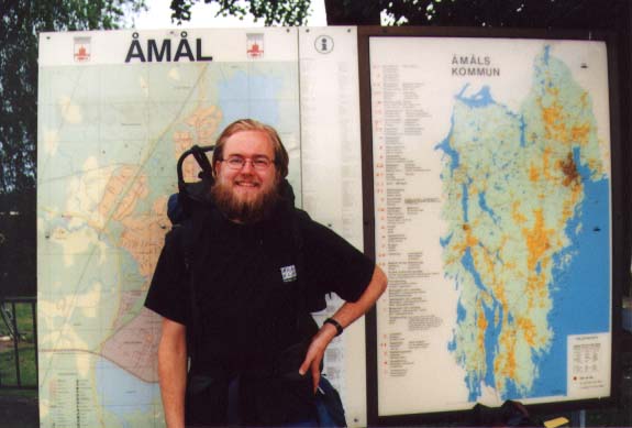 Asemalla otimme kuvia itsestämme Åmålin kartan edessä, ja Timo opetteli kartasta tärkeimmät osat ulkoa. Kaupungissa oli myös retkeilymaja, suunnistimme siis ensinnä sinne. Joka paikassa mainostettiin seuraavana päivänä alkavia vuosittaisia Åmålin bluesfestareita, joiden kaukaisimmat esiintyjävieraat tulisivat Norjasta ja Amerikasta asti. Kohtasimme kulkiessamme myös pankkiautomaatin, postin ja kaupan - lisäeväs ei milloinkaan ole pahitteeksi. Paikallisesta lelukaupasta Timo kyseli vanhoja Magic-kortteja, mutta myyjä ei tainnut ymmärtää, mistä oli kyse. Pokémoniakaan ei löytynyt kuin teemapakkoina, emme siis ostaneet mitään.