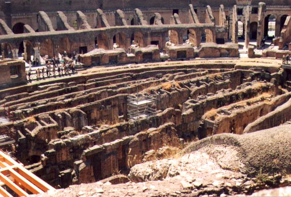Colosseumin sisäänkäynnillä kuulimme tuttua kieltä: "Ja tässä tulee sitten samanlainen portti kuin metrossa..." Aurinkomatkojen opashan se siinä johdatteli ryhmäänsä entiselle gladiaattoreiden taisteluareenalle. Päätimme yrittää päästä pummilla kuulemaan selostuksen. Lippujonot olivat kuitenkin varsin pitkät ja maksettuamme nuorisona puolihintaiset liput (5000 liiraa/kpl), oli opas jo ehtinyt jonnekin piiloon.