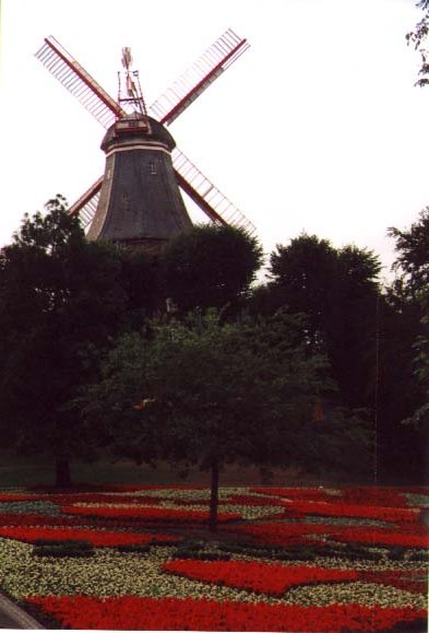 Tien varressa näkyi yhtäkkiä sievä Hollanti-mainos. Tuulimylly seisoi suuren kukkapenkin (-pellon) takana pienen joen varrella. Kaikki ns. Hollanti-kuvat on ilmeisesti käyty ottamassa Bremenissä tai vastaavissa paikoissa.