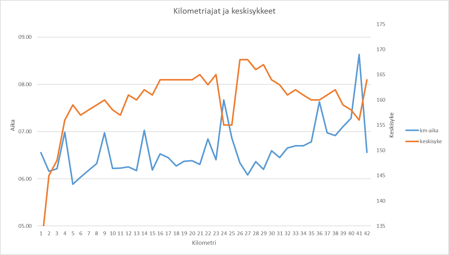 Alkumatkasta juoksu tuntui yllättävän kevyeltä, ja kilometriajat olivat enimmäkseen vain vähän yli kuuden minuutin, ja välillä jopa sen alle. Sykkeeni pysyi hyvin alle 160:n, joten tämä tuntui sopivalta tahdilta. Juomapisteillä otin rauhassa muutaman kävelyaskeleen, ja kävin parikin kertaa puskapissalla.
