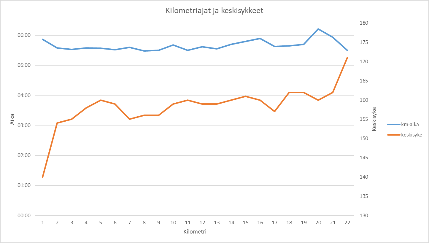 Koko matkalla reitin varren kilometrimerkinnät ja kelloni piippaama kilometriaika osuivat hämmästyttävän hyvin samaan kohtaan. Välillä heittoa ei ollut kuin pari metriä, välillä joitakin kymmeniä metrejä. Kokonaismatkaksi maalissa mittarini näytti 21,16 km.