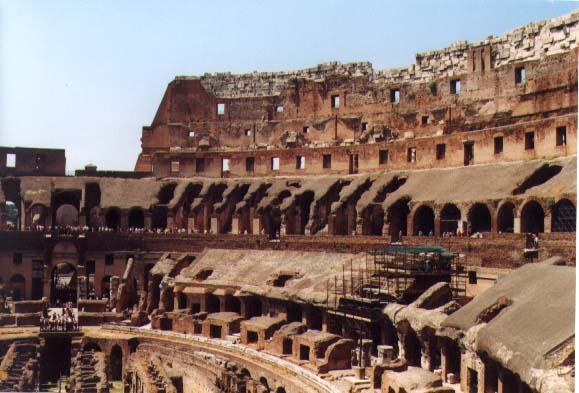 Colosseumin sisäänkäynnillä kuulimme tuttua kieltä: "Ja tässä tulee sitten samanlainen portti kuin metrossa..." Aurinkomatkojen opashan se siinä johdatteli ryhmäänsä entiselle gladiaattoreiden taisteluareenalle. Päätimme yrittää päästä pummilla kuulemaan selostuksen. Lippujonot olivat kuitenkin varsin pitkät ja maksettuamme nuorisona puolihintaiset liput (5000 liiraa/kpl), oli opas jo ehtinyt jonnekin piiloon.