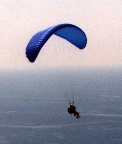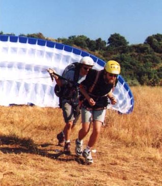Päivän suurena ohjelmanumerona oli liitovarjoilu. Kävimme hakemassa kaverin ja ajoimme korkealle vuorelle. Toinen kaveri hyppäsi ensin kokeillakseen tuulta ja leijuikin ilmassa toistakymmentä minuuttia. Marco viritti varjoaan oikeaan asentoon ja auttoi sitten valjaat ylleni. Ilmaan nousua varten piti juosta, vasta ilmassa istua, ottaa ohjausnarut Marcon istuutumisen ajaksi ja antaa ne sitten takaisin. Alastulossa ei pitänyt pysähtyä, vain juosta.