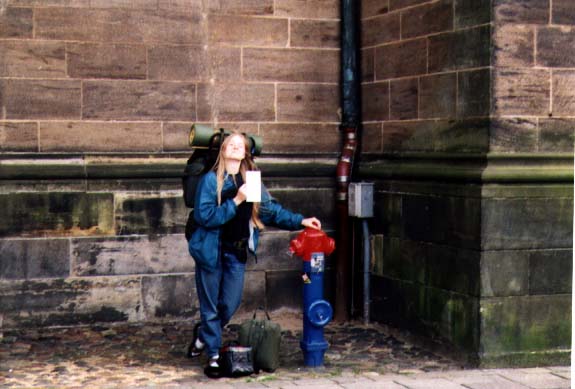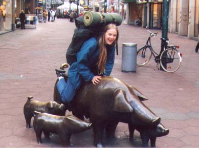 Päätimme pitkästä aikaa lähteä kaupunkia ja nähtävyyksiä katsomaan, soittoniekkapatsas oli ainakin nähtävä. Aseman edestä noudimme kartan, joka luetteli selvästi nähtävyyksiäkin. Aivan ensimmäiseksi kuitenkin puikkelehdimme S-Bahnien välistä Pizza Hutiin syömään. Meitä palvellut tyttö varmaan sai sen käsityksen, että minä ymmärrän saksaa ja Timo puhuu sitä. Kesken syönnin tyttö tuli ilmoittamaan, että hänen täytyisi rahastaa nyt, sillä hänellä oli vapaailta. Uteliaisuus kielitaidon suhteen voitti, ja tyttö kysyi, ymmärsimmekö häntä lainkaan.